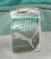 Comparamos aqui esta camisola da Puma com uma sem marca do ano anterior, 1980/81, e uma Le Coq Sportif de 1984/85. Fica claro que também em 1981/82 as camisolas listadas do Sporting eram ligeiramente azuladas! Ou isso, o a cor desbotou, o que é possível.